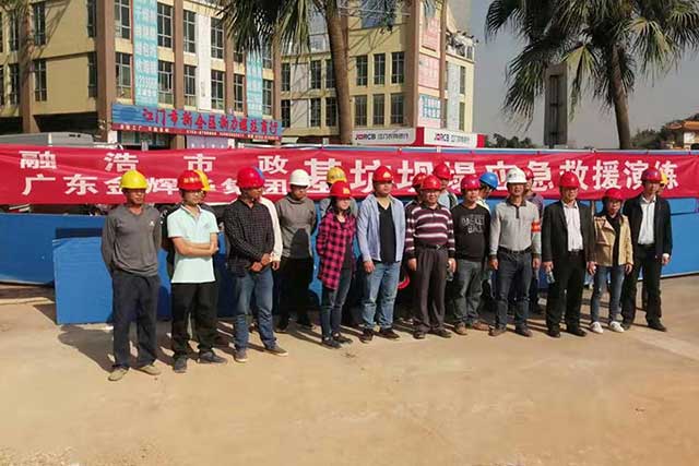 2019年11月21日(星期四)早上9:30,廣東金輝華集團(tuán)公司承建的江門(mén)市供水管網(wǎng)擴(kuò)容改造建設(shè)項(xiàng)目勘察設(shè)計(jì)施工總承包工程,在江門(mén)市蓬江區(qū)奇榜片區(qū)五邑機(jī)電城旁施工現(xiàn)場(chǎng),進(jìn)行”基坑坍塌應(yīng)急救援演練”活動(dòng)。演練的目的:1、評(píng)估安全事故的應(yīng)急預(yù)案的響應(yīng)啟動(dòng)執(zhí)行力和響應(yīng)及時(shí)性,分析預(yù)案內(nèi)容的針對(duì)性和真實(shí)性;2、檢驗(yàn)應(yīng)急響應(yīng)人員對(duì)應(yīng)急預(yù)案的了解及實(shí)際操作熟悉能力,對(duì)應(yīng)急物資的使用熟悉程度,評(píng)估應(yīng)急知識(shí)培訓(xùn)的