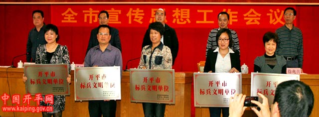 從2014年3月26日下午召開的全市宣傳思想工作會議上獲悉,去年我市深入開展群眾性精神文明創(chuàng)建活動,全市共有15條村創(chuàng)建“開平市標兵文明村”,5個單位創(chuàng)建“開平市標兵文明單位”。經檢查驗收,各創(chuàng)建點均達到創(chuàng)建要求。市委常委、宣傳部部長陳靖等領導在會議上為2013年開平市標兵文明村、標兵文明單位頒獎。我司代表高迎春代表公司接受標兵文明單位牌匾。 我司代表高迎春同志(左一)在開平市標兵文明單位表彰會上
