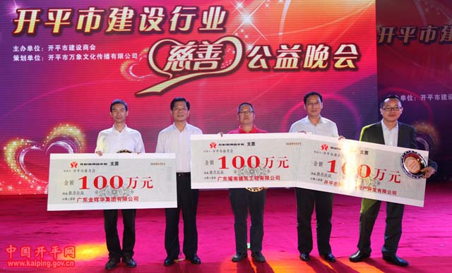 2013年3月22日,開平市建設(shè)商會(huì)主辦的“開平市建設(shè)行業(yè)慈善公益晚會(huì)”在人民公園隆重舉行。江門市住房城鄉(xiāng)建設(shè)局局長(zhǎng)馬克烈,開平市黃耀雄、文彥、吳平超、張星杰等四套班子領(lǐng)導(dǎo),我集團(tuán)公司董事長(zhǎng)張國(guó)球、總裁李甫等均出席晚會(huì)。在慈善公益晚會(huì)中,表演者帶來了豐富多彩的節(jié)目,演出涵蓋舞蹈、雜技、獨(dú)唱等,讓觀眾體會(huì)到歌聲的力量和溫情,激發(fā)大眾對(duì)公眾事業(yè)的熱忱。捐贈(zèng)儀式穿插其中,我司以及耀南公司、碧桂園公司各捐