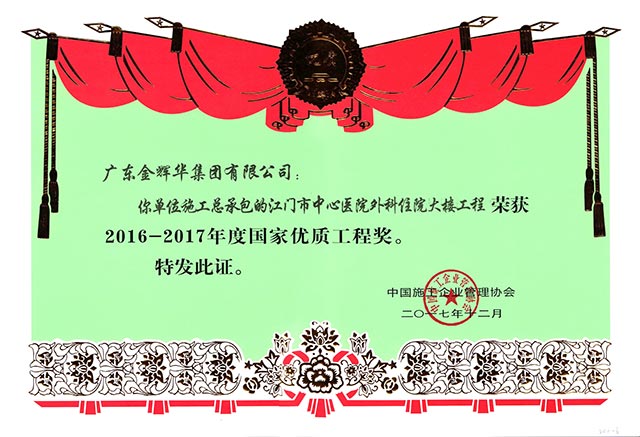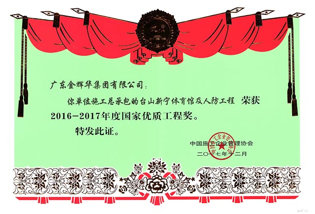 2017年 12月13日,由中國施工企業(yè)管理協(xié)會主辦的“2016-2017年度國家優(yōu)質(zhì)工程獎總結(jié)表彰大會”在北京人民大會堂舉行。廣東金輝華集團有限公司“江門市中心醫(yī)院外科住院大樓工程”和“臺山新寧體育館及人防工程”,榮獲國家優(yōu)質(zhì)工程獎兩項。