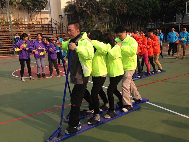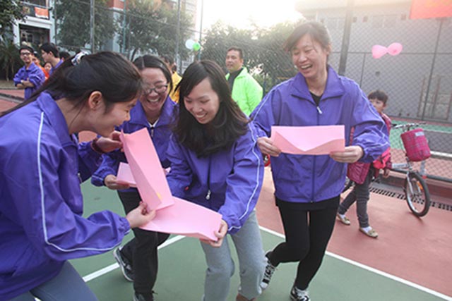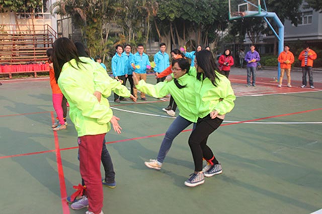 本次趣味運動會采取大學(xué)生村官和金輝華集團(tuán)黨團(tuán)員代表混合組隊的形式,組成4隊開展比賽。比賽項目有齊心協(xié)力、二人三足接力、搶凳仔、義氣踢毽和全心傳意。