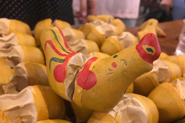 開平市水口鎮(zhèn)聯(lián)竹鄉(xiāng)制作鎮(zhèn)濠泥雞玩具已有二百多年歷史,以前每到農歷春節(jié)前夕,來自鶴山、臺山、恩平、新會等地的商販們便駕車來采購泥雞作年貨銷售。泥雞外形古樸、價格便宜,深受人們的喜愛。大年初一是雞日,大量泥雞上市,一時泥雞啼聲四起,給人們帶來歡欣和喜氣。